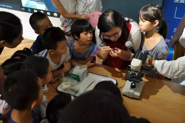 顯微鏡觀察細(xì)胞環(huán)節(jié),孩子們排起了長(zhǎng)長(zhǎng)的隊(duì)伍,興高采烈地實(shí)際動(dòng)手操作顯微鏡。想必這些小小的腦袋里會(huì)留下這樣的嘆號(hào):“原來(lái)還有一個(gè)肉眼看不到的世界是這個(gè)樣子”。