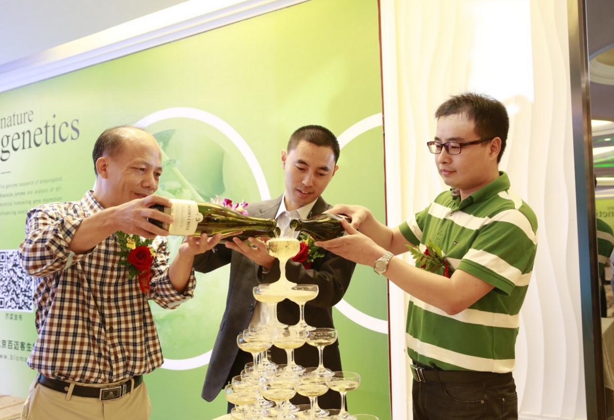 會中,眾嘉賓同時為發(fā)布會揭幕,迎來全場嘉賓們的矚目及掌聲,制作精美的大型雜志模型浮現(xiàn),同時芥菜基因組數(shù)據(jù)全球同步發(fā)布。接下來中國農(nóng)科院王曉武教 授、百邁客鄭洪坤總裁、浙江大學楊景華教授一起澆注香檳塔。于軍老師等嘉賓隨后一同舉杯,共同祝賀蕓薹屬科研成果的發(fā)布。會上有二十幾家媒體到場,媒體提 問環(huán)節(jié)也十分引人注目,cctv4、科技日報提出了百姓關注的餐桌問題;測序中國、生物探索、生物谷行業(yè)媒體就兩篇論文的基因組發(fā)布技術和潛在的應用前景 與嘉賓進行探討,嘉賓們紛紛做了精彩的回答。