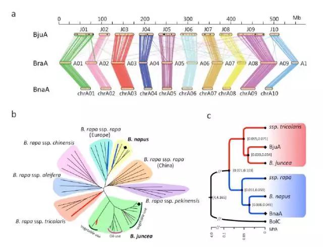 我們對10個菜用的芥菜、7個油用的芥菜,5個甘藍型油菜基因組、27個白菜基因組(多亞種)進行了重測序分析,并繪制如上圖b中的進化樹。從b圖中可以看到芥菜全部聚在一起,沒有出現分散的情況,說明芥菜中A的基因組是來源于同一個亞種,屬于單系起源。