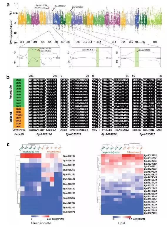 通過菜用和油用芥菜群體進行選擇清除分析,發(fā)現dominance的基因被篩選出來的比例較高,同時結合轉錄組數據,這部分基因在油用和菜用兩個群體中差異表達。同時通過上面的分析發(fā)現與硫苷,脂類代謝顯著相關并且存在dominance的基因組,這些基因在油用菜用群體中有各自獨特基因分型。