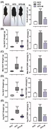 1)?HFD組小鼠體重顯著增加,而HFD+褪黑素組小鼠體重得到有效控制,如下圖A。