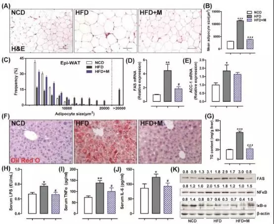 1)?通過比較Epi-WAT脂肪細胞的大小,發(fā)現(xiàn)HFD組脂肪細胞顯著增大;而褪黑素通過減少>12000μm2的細胞數(shù)目,增加2000–8000μm2的細胞數(shù)目,使HFD+褪黑素組脂肪細胞大小維持在正常范圍內(nèi),如下圖A-C。
