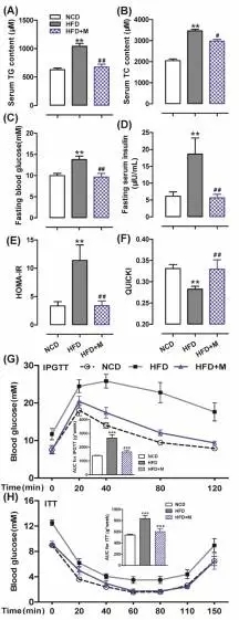 1)?通過比較血脂含量,發(fā)現(xiàn)HFD顯著提高TG和TC含量,而褪黑素能顯著降低TG和TC的含量,如下圖A和B。