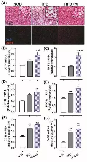 1)?通過棕色脂肪組織(BAT)石蠟切片分析,發(fā)現(xiàn)HFD促進脂質(zhì)積累(切片白化),而褪黑素表現(xiàn)出相反的作用,并且褪黑素促進BAT中UCP1蛋白的表達,如下圖A。