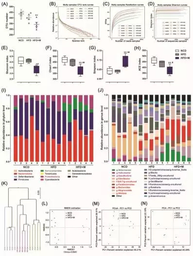 4)?UPGMA、NMDS、PCA、PCoA分析,發(fā)現(xiàn)褪黑素顯著改變了腸道菌群的結(jié)構(gòu),如下圖K-N。