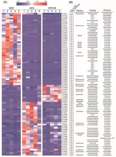 1) ?如下圖顯示,在三個分組中一共找到85個相對豐度有顯著差異的OUT。與NCD組相比,HFD組有27個相對豐度顯著增高的OTU,42個顯著降低的OTU。與HFD組相比,添加了褪黑素的組有10個相對豐度顯著增高的OTU,20個顯著降低的OTU;而在這30個差異性的OTU中,有14個OTU的變化方向與和NCD組比較的結(jié)果完全相反。這14個OTU屬于Ruminococcaceae、Desulfovibrionaceae、Bacteroides、Porphyromonadaceae、Helicobacteraceae、Christensenellaceae,有研究表明這些微生物與肥胖相關(guān)。