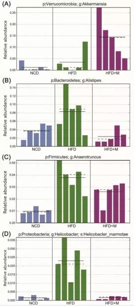 2) LEfSe分析,發(fā)現(xiàn)褪黑素顯著提高Akkermansia的相對豐度,Akkermansia即是降低高脂肪膳食小鼠體重的有益菌。而褪黑素顯著降低Alistipes、Anaerotruncus、Helicobacter?marmotae的相對豐度,則這三種細菌預(yù)防肥胖的有害菌??傊?strong>褪黑素能夠使高脂肪膳食小鼠的腸道菌群由失調(diào)狀態(tài)轉(zhuǎn)為正常狀態(tài),從而抑制體重的增加。