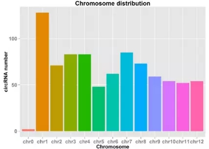 2.染色體來源分析發(fā)現(xiàn),1號染色體產(chǎn)生的circRNA最多。