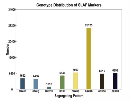 生物信息學分析,父本產(chǎn)生249076個SLAF標簽,母本產(chǎn)生279416個SLAF標簽,平均深度分別為32.62×和20.53×。對于F1作圖群體,每個個體平均產(chǎn)生190361個SLAF標簽,平均深度為8.80×。其中62772個多態(tài)性SLAF標簽用于基因分型(圖1)。除aa×bb類36647個SLAF標記被用于圖譜構(gòu)建,適合F1群體的后期連鎖圖譜構(gòu)建,有效多態(tài)性率為7.99%。