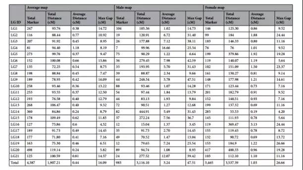 經(jīng)過濾,得到可用于作圖的 SLAF 標簽 4678 個,通過兩兩標簽間計算重組率和 MLOD 值,根據(jù) MLOD 值將標簽分為 21 個連鎖群,最終確定上圖標記共 4387 個,雄性圖譜全長3116.10 cM,共983個標記,平均圖距3.24 cM。雌性圖譜全長3537.39cM,共3465個標記,平均圖距為1.03cM。整合圖譜全長1907.21 cM,平均圖距為0.44 cM(圖2)。上圖率為 93.78%,上圖標簽偏分離比例 2.52%。