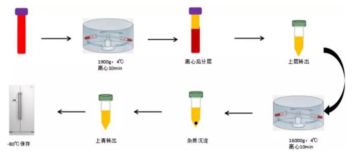 使用EDTA抗凝管采集血液樣品(采集后的血液樣品可置于室溫或4℃短暫保存,但不得超過1h)。1900g(或3000rpm),4℃,離心10min。小心轉(zhuǎn)移上層血漿(黃色)至新的1.5ml離心管中,槍頭不要觸碰中間層(白細(xì)胞和血小板層)。一般情況下,10ml的血液可分離出4-5ml血漿。將分離出的血漿16000g,4℃,離心10min。槍頭不要觸碰到管底一側(cè)的雜質(zhì),小心轉(zhuǎn)移上清到一個(gè)新的1.5ml離心管中,-80℃保存。大體積干冰運(yùn)輸。