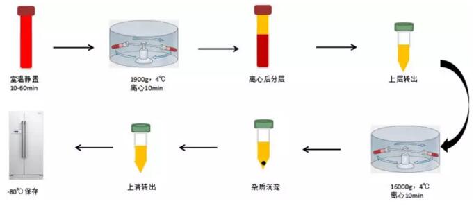 使用含凝血激活劑的采血管或普通真空采血管采集血液樣品,室溫靜置10-60min使血液凝集。1900g(或3000rpm),4℃,離心10min。小心轉(zhuǎn)移上層血清(黃色)至新的1.5ml離心管中,槍頭不要觸碰中間層(白細(xì)胞和血小板層)。一般情況下,10ml的血液可分離出3-5ml血清。將分離出的血清16000g,4℃,離心10min。槍頭不要觸碰到管底一側(cè)的雜質(zhì),小心轉(zhuǎn)移上清到一個(gè)新的1.5ml離心管中,-80℃保存。大體積干冰運(yùn)輸。