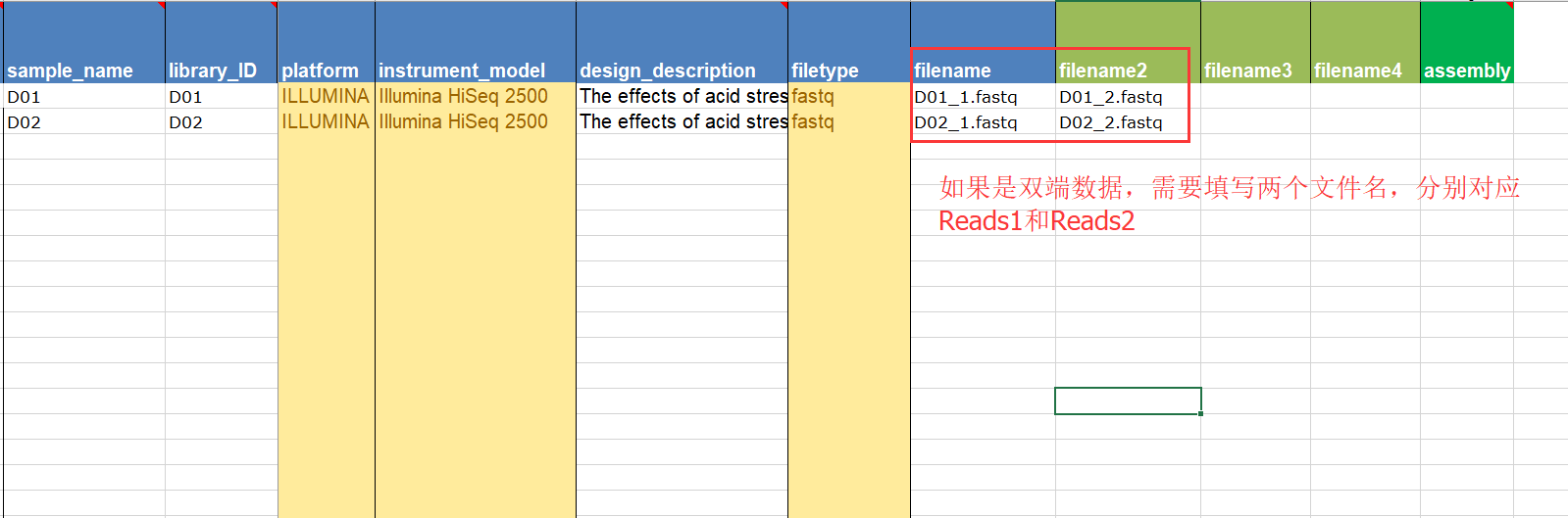 第六步:樣本具體信息,需要我們下載表格填寫,表格中綠色的為必填,藍(lán)色的需要至少填一個(gè),其它內(nèi)容可以選填或者不填寫,如果是生物學(xué)重復(fù)需要添加一列replicate,填寫完成后需要將信息粘貼到文本文件中(TXT格式),然后上傳到網(wǎng)站上;