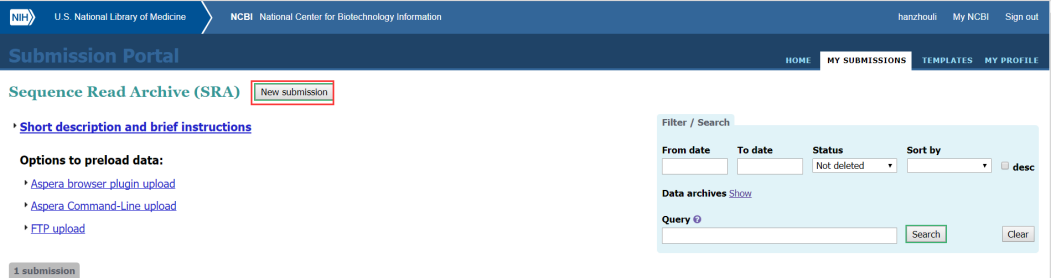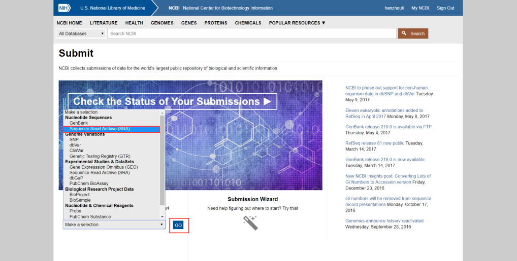 首先,登錄NCBI主頁面后點(diǎn)擊Submit進(jìn)入到數(shù)據(jù)上傳頁面,然后選擇SRA數(shù)據(jù)庫點(diǎn)擊GO按鈕后接著點(diǎn)擊New submission(操作界面見下圖);