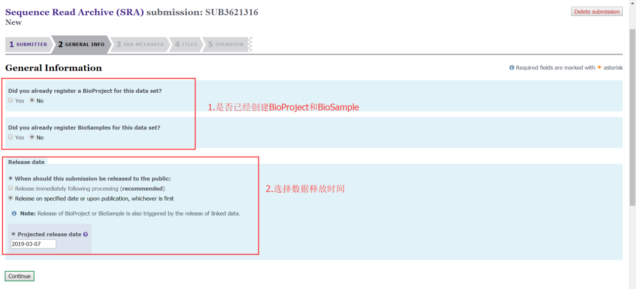 第三步:填寫B(tài)ioSample、BioProject和數(shù)據(jù)釋放時(shí)間(之前沒有創(chuàng)建BioSample、BioProject可以選擇NO);