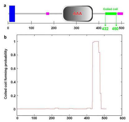基因組和cDNA序列分析顯示,CsARN6.1擁有2個(gè)外顯子,被預(yù)測為編碼含有511個(gè)氨基酸殘基的AAA-ATPase結(jié)構(gòu)域蛋白,該蛋白中含有一個(gè)coiled-coil結(jié)構(gòu)域(圖6),前期關(guān)聯(lián)到的SNP02即位于該結(jié)構(gòu)域,由于該SNP的突變導(dǎo)致Asp被替換成Gly,Zaoer-N為CsARN6.1^Asp型,表現(xiàn)出較強(qiáng)的ATP酶活性,而Pepino為CsARN6.1^Gly型,幾乎沒有ATP活性(圖7)。