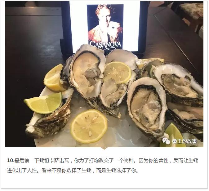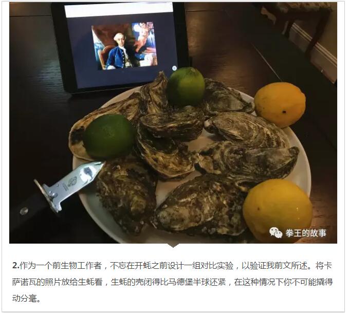 我曾經(jīng)做過一個(gè)實(shí)驗(yàn),把卡薩諾瓦的畫像放在一盤生蠔面前,然后用有道詞典里的意大利語發(fā)音反復(fù)播放“Giacomo Girolamo Casanova”,這盤生蠔當(dāng)時(shí)就怒了,以至于我把他們放到烤箱里烤了20分鐘都無法將殼撬開。—–在殺父之仇面前,生蠔們突破了自己的生理極限。