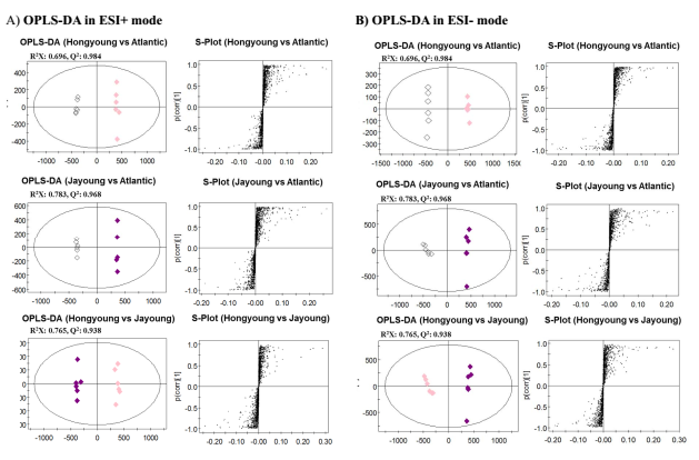 在正和負模式下的正交偏最小二乘判別分析(OPLS-DA)的分數(shù)圖和散點圖