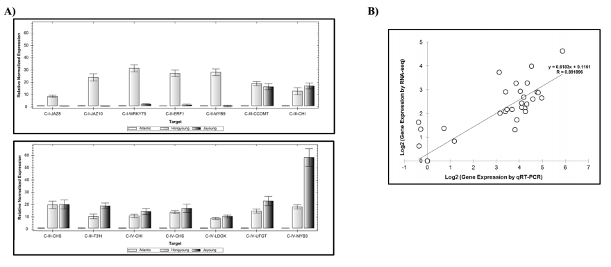 隨機挑選 14 個基因進行 RT-RCR 驗證,結(jié)果表明 Cluster I和Cluster II 中的基因(JAZ8, JAZ10, WRKY75, ERF1 和 MYB9)在 Hongyoung 的表達量較高;ClusterIV中的基因(MYB3和UFGT)在Jayoung中表達水平較高;而 Cluster III 中的基因在 Hongyoung 和 Jayoung 中的表達水平無明顯差異。RNA-seq和RT-PCR相關(guān)性系數(shù)0.89,進一步證明測序結(jié)果的準(zhǔn)確性。