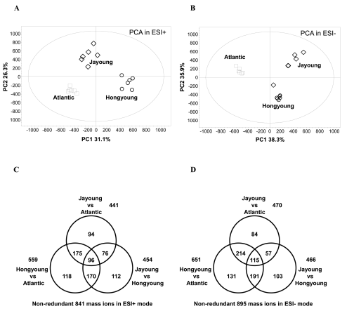 對三種不同色澤馬鈴薯樣本進行主成分分析,結(jié)果顯示不同品種馬鈴薯代謝物差異顯著。代謝組檢測表明,在正離子模式下,共檢測出841個信號離子,其中Hongyoung和Atlantic共有559個信號離子,Jayoung 和Atlantic 共有441個信號離子,Jayoung 和Hongyoung 共有 454 個信號離子;在負離子模式下,共檢測出895個信號離子,其中Hongyoung 和 Atlantic共有 651 個信號離子,Jayoung 和Atlantic 共有470個信號離子,Jayoung和Hongyoung共有 466 個信號離子。