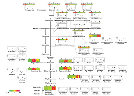 花青素是苯丙素通路中類黃酮合成的花色素苷的?;擒?。據(jù)報道,花青素衍生物飛燕草色素(Dp),芍藥色素(Pn)和錦葵色素(Mv)是紫色和深色的色素來源,而花青色素(Cy)和花葵素(Pg)的衍生物是亮紅色果實中的主要色素。結(jié)果顯示,Hongyoung與Jayoung在苯丙素合成途徑下游的黃酮類組分差異顯著,表明這些代謝物可能是造成馬鈴薯品種間色澤差異的關(guān)鍵因素。Hongyoung中芹黃素、山柰酚、二氫山柰酚和天竺葵色素衍生物的含量較高,而Jayoung中芍藥花青素、牽牛花色素、飛燕草色素和錦葵色素衍生物積累較多。