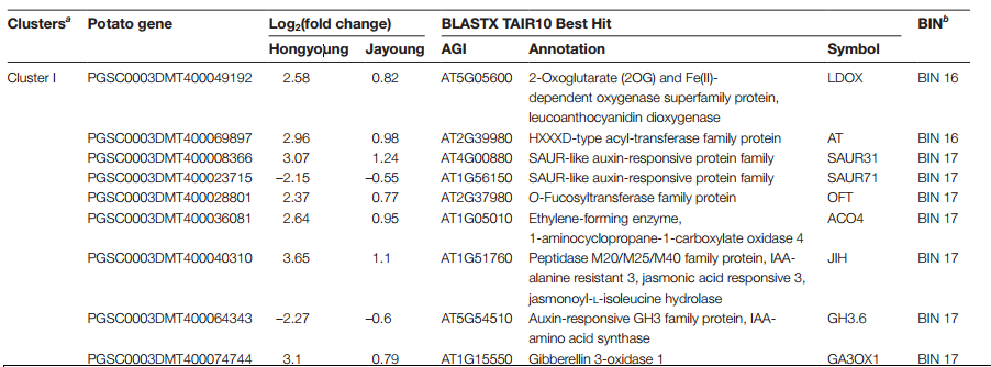 Hongyoung 、 Jayoung和Hongyoung 和 Jayoung共1044個差異基因;Hongyoung 和 Atlantic 中有 756 個差異基因,其中482 個基因上調(diào),274 個基因下調(diào)。Jayoung 和 Atlantic 中有519 個差異基因,其中有248個上調(diào)基因,273個下調(diào)基因。根據(jù)其注釋功能將其分為20組(主要BIN),分為未知注釋轉(zhuǎn)錄本(37.7%),蛋白質(zhì)活性調(diào)控(10.3%),應(yīng)激(9.6%) ,其他代謝(7.3%),轉(zhuǎn)錄調(diào)控因子(5.7%),次級代謝(5.3%)和信號傳導(dǎo)(4.0%)。