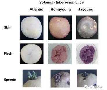 樣品準(zhǔn)備:Hongyoung(淡紅色)、Jayoung(深紫色)、Atlantic(白色),在室溫散光照射下,誘導(dǎo)馬鈴薯發(fā)芽,收集嫩芽,每個品種6個生物學(xué)重復(fù),每個重復(fù)由三個單株混合而成,共18個樣本。