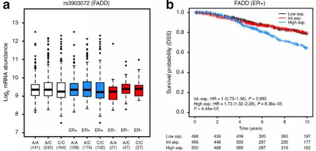 作者所納入的風(fēng)險SNP在此之前只有一個位點(16q12.1-rs3803662)報道了與疾病預(yù)后相關(guān)。本研究中作者直接分析了代謝型乳腺癌隊列中潛在的靶基因的表達(dá)水平與的患者預(yù)后之間的關(guān)聯(lián)(分別對ER +和ER-亞組進(jìn)行生存分析)。其中32個靶基因(33%)與ER +乳腺癌患者的DSS相關(guān),6個DSS相關(guān)的靶基因為eQTL靶基因。