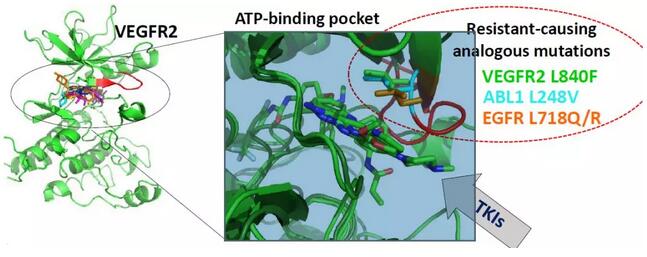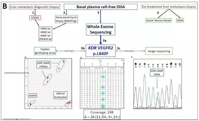 西班牙國家癌癥研究中心(CNIO)胃腸癌臨床研究組的學者們,納入一例RAS / BRAF / PIK3CA未發(fā)生突變且對抗VEGF抑制劑具有抗性的轉(zhuǎn)移性結(jié)腸直腸癌患者,收集其血漿提取cfDNA,分離白細胞提取gDNA以及轉(zhuǎn)移組織提取tDNA,進行全外顯子組測序,發(fā)現(xiàn)WES-cfDNA與腫瘤外顯子組測序結(jié)果一致率為77%,且能夠鑒別KDR / VEGFR2 L840F克隆,該體細胞突變是患者難治性的原因。其他腫瘤數(shù)據(jù)庫如TCGA等KDR體細胞突變的樣本比例在1-3%,且位于其他癌癥相關(guān)激酶(如EGFR,ABL1和ALK)中經(jīng)常突變的蛋白質(zhì)殘基中。此外,作者還進行了一系列功能實驗,包括不同細胞系VEGFR2突變體異位表達、激酶和藥物敏感性測定以及細胞和患者衍生的異種移植瘤實驗。結(jié)果表明,L840F對抗血管生成藥物產(chǎn)生強烈的抗性,而KDR熱點突變體R1032Q賦予對強VEGFR2抑制劑的敏感性。小鼠移植瘤實驗表明VEGFR2突變體D717V,G800D,G800R,L840F,G843D,S925F,R1022Q,R1032Q和S1100F 促進小鼠腫瘤生長。