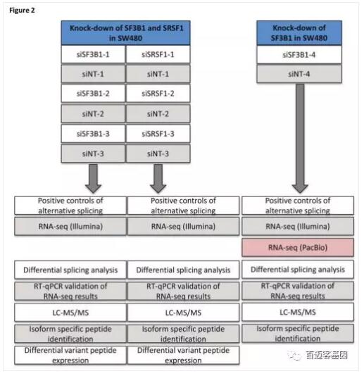 為了驗證能通過splicify得到的isoform,同時增加新的轉(zhuǎn)錄本,Iso-seq被用于在SW480細(xì)胞中SF3B1的下調(diào)和siNT對照(如圖2所示)的檢測中。