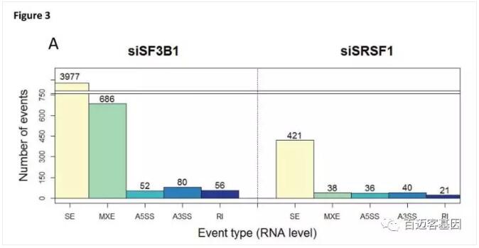 轉(zhuǎn)錄組分析顯示siSF3B1和siSRSF1的可變剪接事件與對照組相比有顯著差異(圖3A),證明對剪接因子的操作導(dǎo)致了差異剪接的產(chǎn)生。