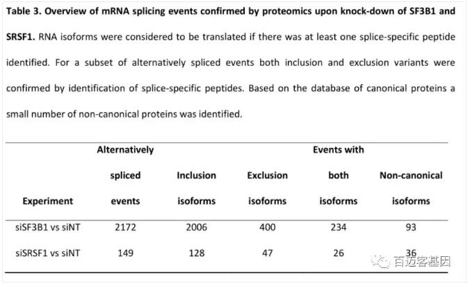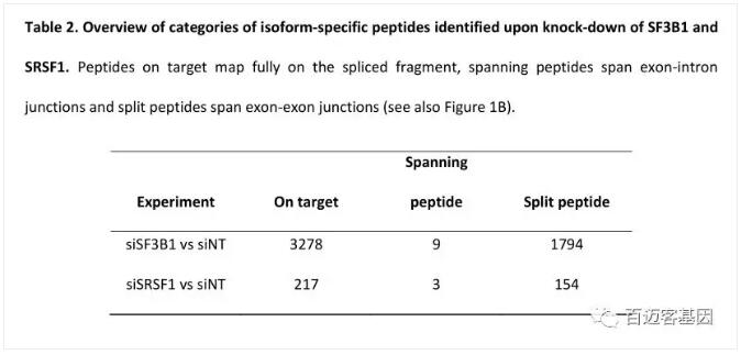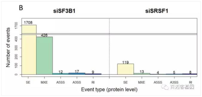 基于所有的isoform特異肽段,siSF3B1和siSRSF1在蛋白水平上分別確定了2172和149個剪接事件(如表3所示)。