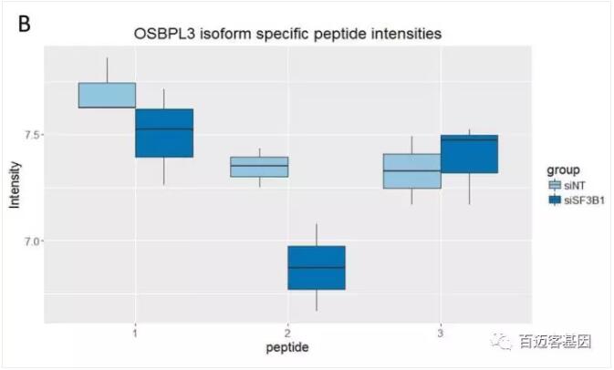 約65%的顯著差異表達(dá)的splice-specific-peptides在RNA水平上表現(xiàn)出一致的表達(dá)差異。例如,下調(diào)SF3B1的實驗組中,OSBPL3 9號外顯子中分別有3個支持外顯子保留和1個支持外顯子去除的peptides被鑒定出來。兩種inclusion specific-peptides表達(dá)明顯較低,而exclusion specific -peptides則與對照相比表現(xiàn)出較高的表達(dá)量(如圖5所示)。