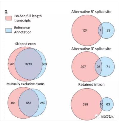 在研究可變剪接方面,Iso-Seq測到的全長轉(zhuǎn)錄本對基因組注釋結(jié)果是一個極大補充,尤其在內(nèi)含子保留、3 ‘可變剪接和5 ‘端可變剪接事件中,Iso-Seq測到的全長轉(zhuǎn)錄本與基因組注釋的重疊較小。這表明,基因組注釋中缺少一些完整的或部分的內(nèi)含子序列可變剪接的isoform形式。