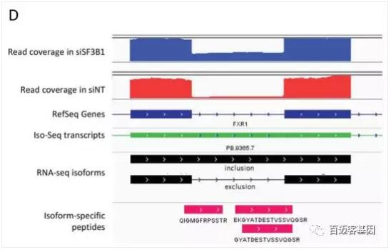 例如,全長轉(zhuǎn)錄本進(jìn)行測序結(jié)果支持FXR1內(nèi)含子保留的三種肽段,因此這種內(nèi)含子保留事件也存在于注釋文件中。Illumina 測到的短 reads支持這一事件,并提供了定量的證據(jù),表明它在SF3B1的下調(diào)過程中比其對照組(圖6D)更高表達(dá)。