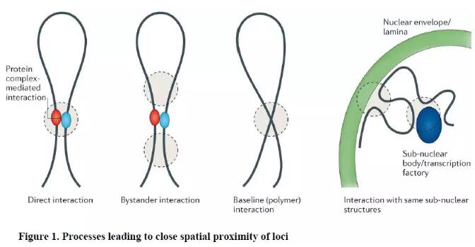 這些3C及其衍生技術(shù)報告了細胞群體中兩個基因座空間上緊密接近的頻率,但未區(qū)分功能性與非功能性的位點間關(guān)聯(lián),也未揭示導(dǎo)致其共定位的機制??臻g上緊密接近包括以下幾種情況:1)Direct interaction:兩個基因座之間直接、特異性接觸的結(jié)果(由結(jié)合它們的蛋白質(zhì)復(fù)合物介導(dǎo));2)Interaction with the same sub-nuclear structures:成對基因座與相同亞核結(jié)構(gòu)間接共定位的結(jié)果(例如核纖層,核仁、或轉(zhuǎn)錄工廠等)。3)Bystander interaction:在某些細胞中,由于鄰近的某些遠程互作或其他約束因素決定的染色質(zhì)纖維的堆積和折疊的造成的非特異性接觸,或者由于擁擠核中的隨機(非特異性)碰撞導(dǎo)致的非特異性接觸。4)Baseline(polymer) interaction:染色質(zhì)纖維非常長,而且柔韌,染色體具有聚合體性質(zhì),因此,即使在沒有任何特定高階結(jié)構(gòu)的情況下,這個特征在很大程度上也決定了基因座間相互作用的頻率。