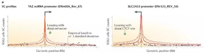 盡管5C技術(shù)存在上述缺陷,但仍舊揭示了染色質(zhì)不同區(qū)域間遠程互作參與基因表達調(diào)控的普遍規(guī)律。Sanyal等人發(fā)現(xiàn)了基因啟動子和遠端基因座之間有數(shù)千個重要的遠距離loop互作,強調(diào)了許多基因啟動子通過染色質(zhì)環(huán)與遠端元件互作的觀點。普遍規(guī)律如下:1)許多染色質(zhì)成環(huán)事件是活性基因啟動子和類似于活性增強子的遠端元件之間的細胞類型特異性互作,這與這些染色體結(jié)構(gòu)在基因活化中的作用一致;2)其中一類豐富的遠程互作即是啟動子區(qū)與絕緣蛋白CTCF結(jié)合位點之間成環(huán);3)通常認(rèn)為調(diào)控元件可以調(diào)節(jié)*鄰近的基因,但是成環(huán)互作經(jīng)常跳過一個或多個基因,這表明基因和元件的線性排列是它們之間功能和結(jié)構(gòu)互作的較差預(yù)測因子;4)基因和調(diào)控元件之間的關(guān)系并不唯一:一個基因可以與多個遠端元件互作,同時一個元件也可以與多個基因互作。