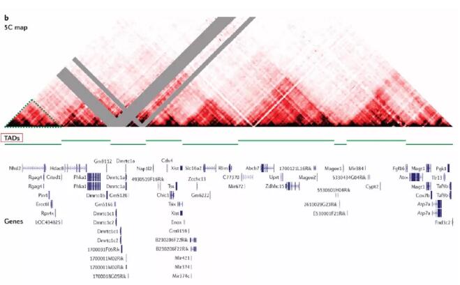 包含小鼠X染色體失活中心的4.5Mb區(qū)域的高分辨率5C互作圖揭示了一系列大的結(jié)構(gòu)域。位于這些TADs內(nèi)的基因座往往頻繁地相互作用,但它們與位于其領(lǐng)域之外的基因座的相互作用要少得多,即TAD內(nèi)部的相互作用強,不同TAD間的相互作用弱。這種特征使研究人員能夠通過分析分辨率較低的全基因組Hi-C互作圖與隱馬爾可夫模型方法結(jié)合,來識別整個人類和小鼠基因組中的TAD。TADs是染色體的通用結(jié)構(gòu)模塊,人類和小鼠的基因組都由2000多個TAD組成,覆蓋了90%以上的基因組。