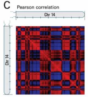 圖片引自Comprehensive mapping of long-range interactions reveals folding principles of the human genome[J]. science, 2009, 326(5950): 289-293,互作矩陣中顏色表示每對1Mb基因座染色質(zhì)間互作相關(guān)性系數(shù)(紅色:1,藍色:-1)。