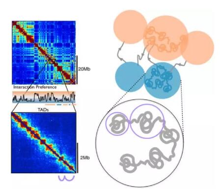 哺乳動物基因組的染色體內(nèi)和染色體間相互作用圖揭示了一種相互作用模式,可以近似分為兩個隔間(A和B,或稱區(qū)室/隔室),它們沿著染色體交替,并且具有約5Mb的特征尺寸。A隔間優(yōu)先與整個基因組中的其它A隔間相互作用。 同樣,B隔間與其它B隔間相關(guān)聯(lián)。隔間信號可以通過互作圖的特征向量擴展來量化。 A / B室信號不是簡單的雙相(僅代表兩種狀態(tài)),而是連續(xù)的,并且與轉(zhuǎn)錄活性指標(biāo),如DNA可及性、基因密度、復(fù)制時間、GC含量和幾個組蛋白標(biāo)記相關(guān)。A-隔間主要是常染色質(zhì)-轉(zhuǎn)錄活躍區(qū)域,B-隔間則主要是聚集在一起的異染色質(zhì)(轉(zhuǎn)錄失活區(qū)域)。