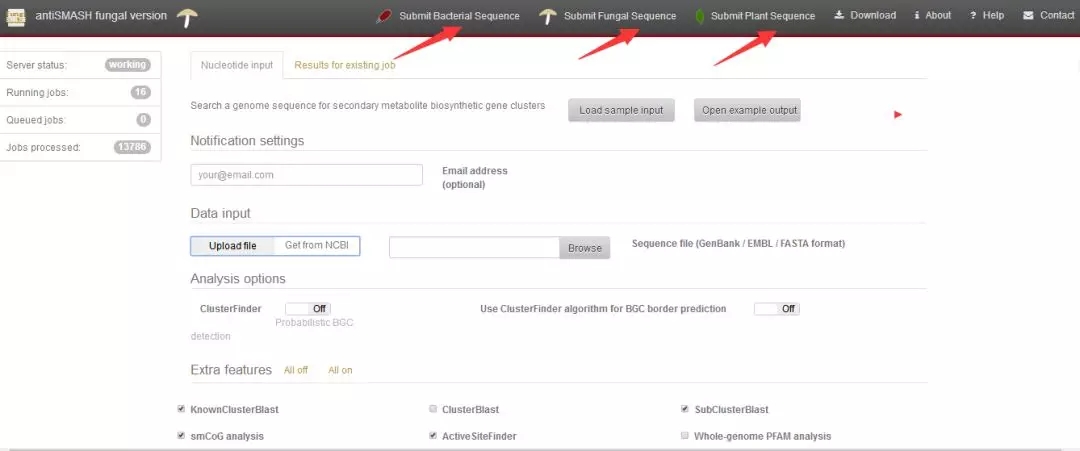 1.次級代謝產(chǎn)物預(yù)測網(wǎng)址:https://fungismash.secondarymetabolites.org ,點擊進(jìn)入界面,可進(jìn)行細(xì)菌、真菌以及植物次級代謝產(chǎn)物預(yù)測;