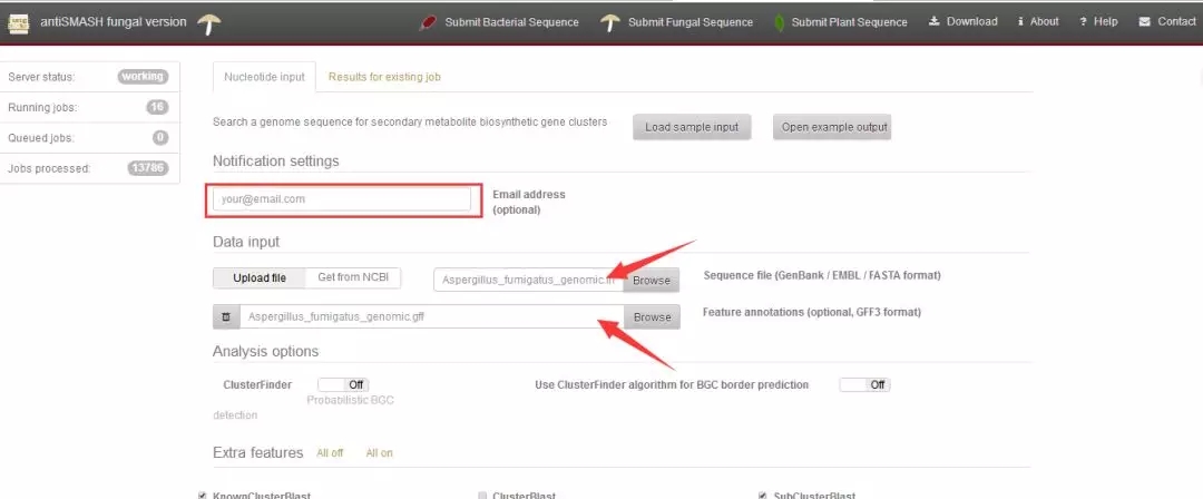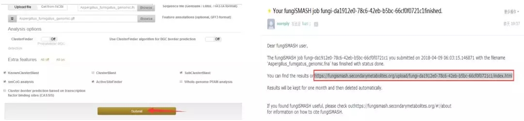 3.其他參數(shù)默認(rèn),點擊“submit”申請次級代謝產(chǎn)物預(yù)測結(jié)果,大約12h內(nèi),系統(tǒng)運行結(jié)束后,預(yù)留郵件會收到預(yù)測結(jié)果;