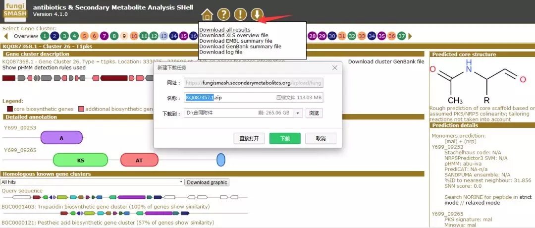 4.進(jìn)入預(yù)留郵箱查看預(yù)測結(jié)果,打開預(yù)測結(jié)果網(wǎng)址即可查看結(jié)果,包含基因簇序列編號,次級代謝產(chǎn)物類型,基因簇所在位置,與已知次級代謝基因簇的結(jié)果比對等;