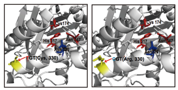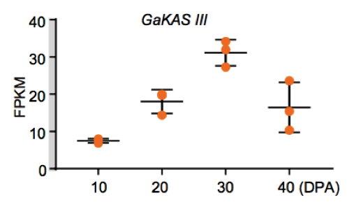 (1)脂肪酸含量相關(guān)基因的定位與研究 棉花是世界上第六大植物油來源,通過GWAS關(guān)聯(lián)分析,在11號染色體上的GaKASIII基因組座位上(Ga11G3851)的第8個(gè)外顯子區(qū)獲得了1個(gè)顯著的SNP位點(diǎn),該基因編碼3-Oxoacyl-[acyl-carrier-protein ACP] synthase III(3-氧?;?[酰載體蛋白]合酶III),如圖8 a-c,KASIII基因編碼的這一關(guān)鍵酶可以使得脂肪酸鏈從C2到C4延伸,并最終確定種子中棕櫚酸(C16:0)和棕櫚油酸(C16:1)的組成。GaKASIII基因的多態(tài)性導(dǎo)致了保守的ACP_synthase_III_(酰載體蛋白合酶III)結(jié)構(gòu)域中半胱氨酸/精氨酸間的置換(圖8 c),單倍型B(TGT,Cys)主要出現(xiàn)在低含油量種質(zhì)中,而在高含油量種質(zhì)中發(fā)現(xiàn)單倍型A(CGT,Arg)(圖8 d-e)。GaKASIII基因在開花后(DPA)的30天表達(dá)量最高(圖9),這是種子油量積累的關(guān)鍵階段,在單倍型種質(zhì)A中,C16:0和C16:1含量以顯著的速率累積(圖10);蛋白質(zhì)結(jié)構(gòu)模型預(yù)測顯示,半胱氨酸/精氨酸殘基位于α螺旋處,該位點(diǎn)靠近酶活性位點(diǎn),同時(shí)是輔酶A(CoA)結(jié)合位點(diǎn)(圖11)。