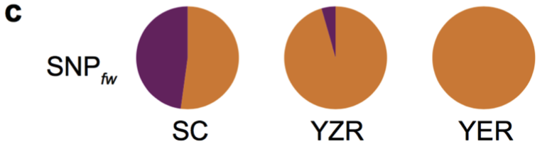 人工選擇在農(nóng)作物的馴化和遷徙的過程中具有重要的作用。群體結(jié)構(gòu)分析顯示當(dāng)K=4時(shí),YER與SC和YZR明顯不同(圖4 b,K=4)。通過兩兩群體間(SC vs. YZR, SC vs. YER, YZR vs. YER)的選擇性清除分析(FST)鑒定出了分別覆蓋到3,162,2,879和3,308個(gè)基因上的59,53和51個(gè)顯著遺傳分化的區(qū)域。SC和YZR之間的21個(gè)分化的區(qū)域(約43.5 Mb 含有915個(gè)基因)在群體SC和YER之間是保守的(圖7 a)。