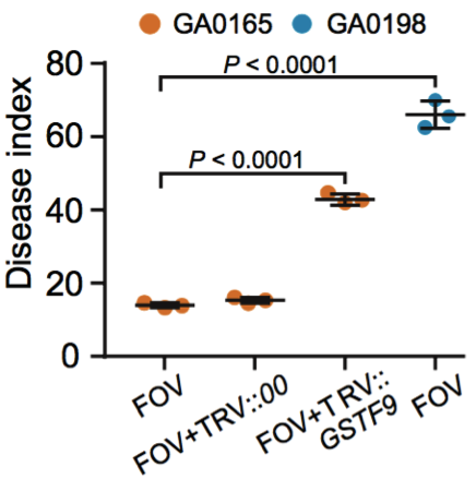 圖15 不同植株處理后的疾病感染指數(shù)比較(GA00198,GA0165,TRV::00和TRV::GSTF9,處理?xiàng)l件:接種FOV)