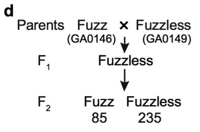 (3)與棉絨相關(guān)基因的研究 棉絨是覆蓋種子表面的短纖維。研究中選擇了亞洲棉種質(zhì)中的158份有絨毛和57份無絨毛材料進(jìn)行GWAS關(guān)聯(lián)分析,最終在8號染色體上(?0.6 Mb至?1.3 Mb的區(qū)間內(nèi))獲得了強(qiáng)烈的關(guān)聯(lián)信號(圖17 a-b)。QTL分析也同樣定位到8號染色體上(圖17 c)。通過有絨毛品系(GA0146)和無絨毛品系(GA0149)雜交獲得的F2代顯示了有絨毛和無絨毛的表型分離比為1:3(圖17 d),說明了棉絨的生長是由單基因座控制。研究中進(jìn)而放大了QTL和GWAS的重疊區(qū),發(fā)現(xiàn)了這個(gè)大約600 kb的區(qū)域包含推測的10個(gè)蛋白編碼基因(圖17 e)。在這一強(qiáng)烈的信號區(qū)域(-logP = 18.95)下或附近,發(fā)現(xiàn)了4個(gè)凱氏帶膜蛋白基因(casparian strip membrane protein genes)。在B-型細(xì)胞周期蛋白上游獲得了1個(gè)信號,而B-型細(xì)胞周期蛋白之前被報(bào)道過與毛狀體和纖維發(fā)育有關(guān)。