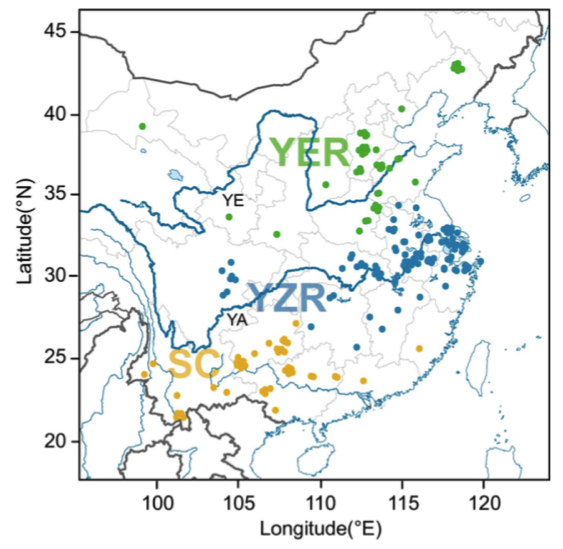 共計(jì)選擇了243份二倍體棉花材料:230份亞洲棉G. arboreum (A2) ?和13份草棉G. herbaceum (A1);材料來源:中國南部(SC),長江(YZR)和黃河(這些區(qū)域代表了中國二倍體棉花大部分的表型和地理多樣性)。