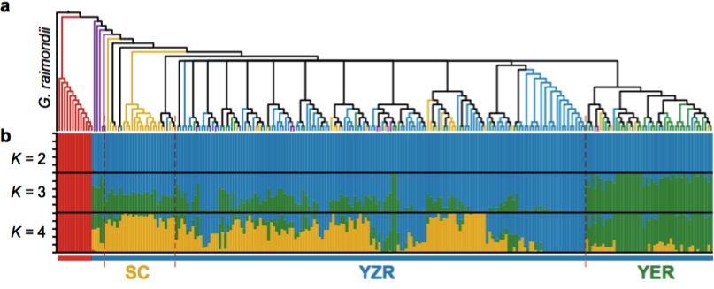 以雷蒙德氏棉(G. raimondii)為外群,利用72,419個(gè)SNPs構(gòu)建系統(tǒng)發(fā)育樹,顯示:G. herbaceum(草棉)和G. arboretum(亞洲棉)聚類成2個(gè)獨(dú)立的群(圖4 a-b)。G. arboretum(亞洲棉)進(jìn)一步又分為SC,YZR和YER三個(gè)群,顯示了地理分布模式的差異,進(jìn)而利用PCA分析支持這一結(jié)果(圖4 c)。同時(shí)發(fā)現(xiàn)了亞洲棉和草棉是由不同的祖先種馴化而形成。