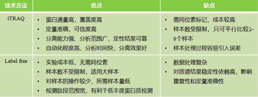 iTRAQ和label-free是目前定量蛋白質組學常用的技術。其中,iTRAQ技術是一種蛋白體外標記定量技術,利用多種同位素特異性標記蛋白的氨基集團,進行質譜串聯(lián)分析,從而比較不同樣品蛋白質的相對含量。另外非標定量法(label-free)是一種不依賴于同位素標記的新型蛋白質定量技術,通過比較質譜分析次數(shù)或質譜峰強度,分析不同樣品蛋白的數(shù)量變化。相比于label-free,iTRAQ的蛋白通量及結果準確性都更高。今天咱們通過實際案例來具體了解一下它們的用途。